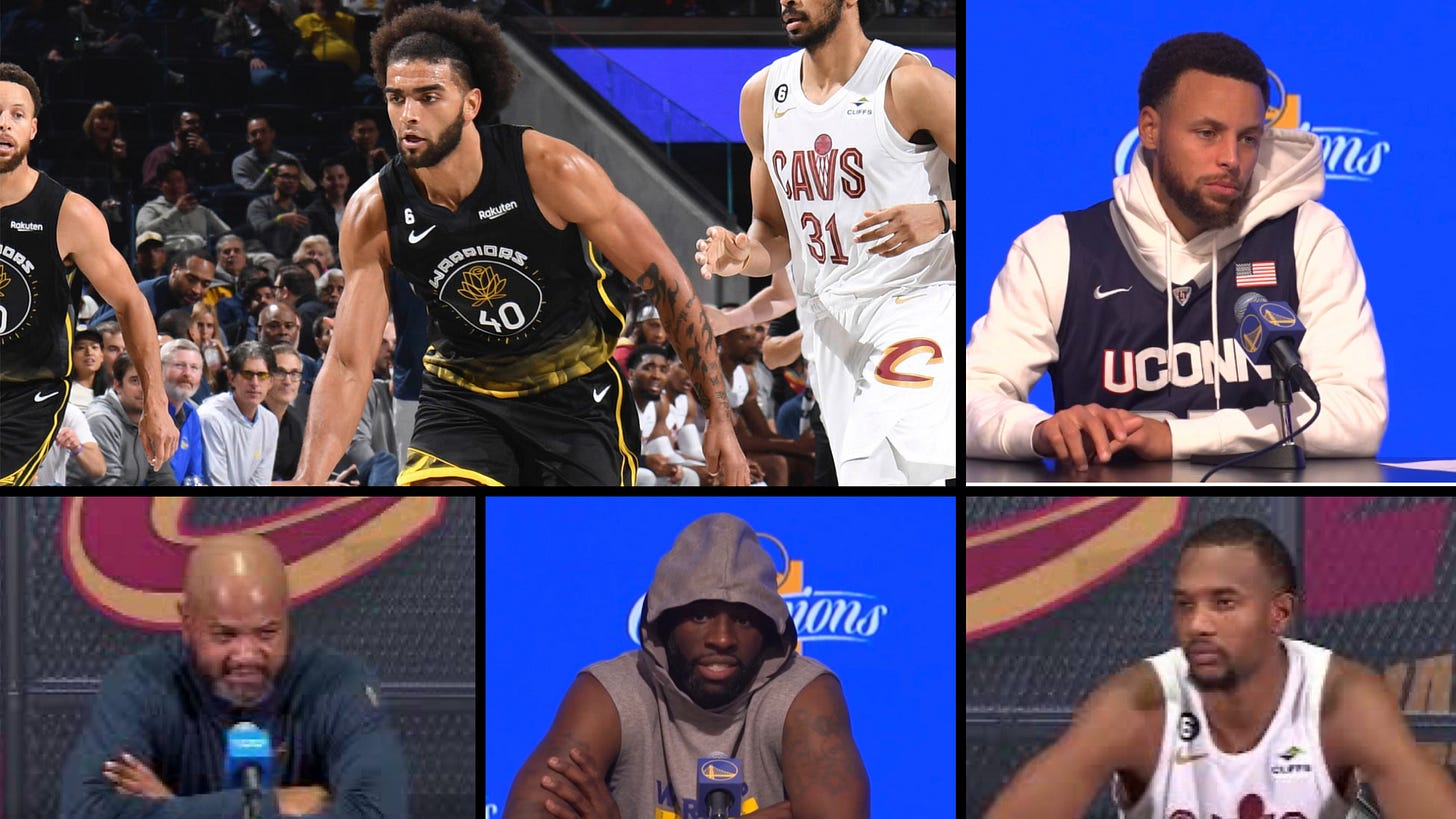 The rest of this post catches us up in reverse chronological order with interviews from JB Bickerstaff (criticizing the non-call on the Klay Thompson moving screen which was confirmed as an incorrect non-call in the NBA’s subsequent L2M report), Evan Mobley (on Bickerstaff telling him to drop into the paint more after the Andrew Wiggins dunk which then led to the Stephen Curry dagger three over Jarrett Allen on the screen set by Looney, see video below plus the Q&As from Draymond Green and Curry), Caris LeVert, Steph, Draymond, Lamb, Kevon Looney, and Steve Kerr.