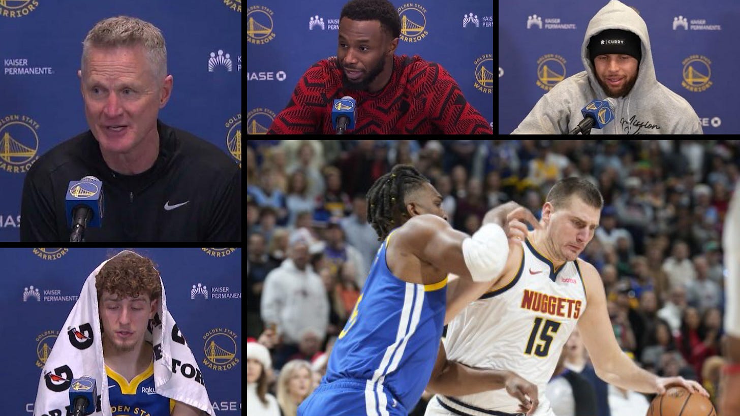 I’ma start off by cutting the old guys some slack. Even though Jonathan Kuminga and Brandin Podziemski played the best on Xmas, keep in mind the 11:30AM tipoff and the altitude of Denver.