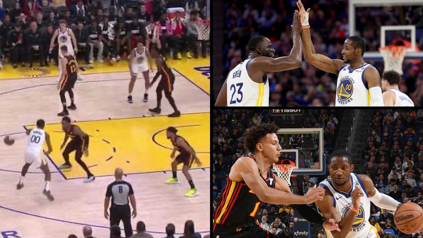 So it looks like Steve Kerr and the coaching staff actually changed things up from “get the ball to Stephen Curry (or Klay Thompson)” and, after all that top-blocking by the Memphis Grizzlies, decided to put Curry in the screener’s role to ultimately “get Jonathan Kuminga the ball” against the Atlanta Hawks last night. Wow! 😱