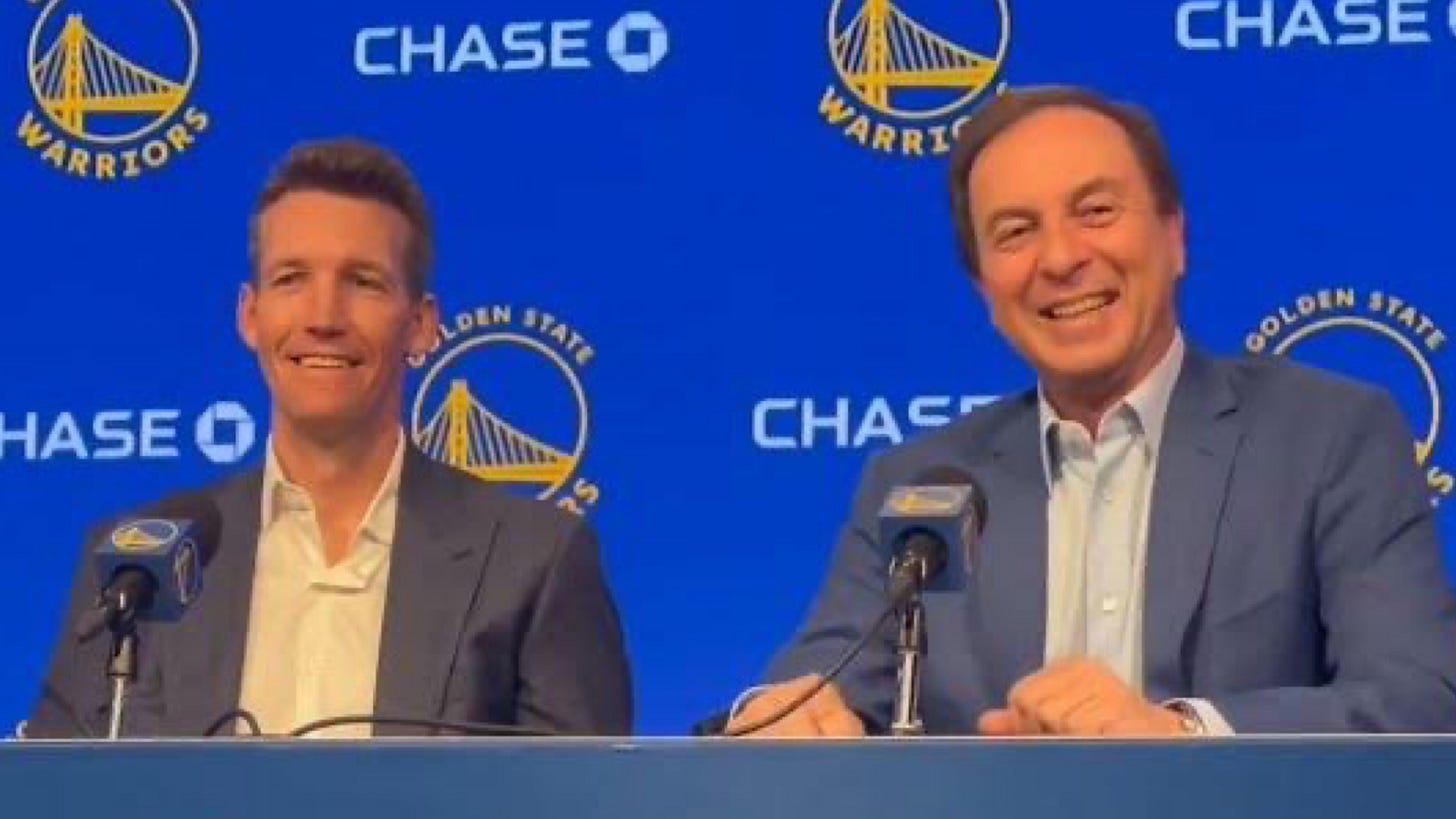 Well, thanks, Joe. Appreciate it. Let me just start with thanking you and Peter and the whole ownership group for this opportunity. Really, really special moment for me and my family. This this is one of the premier organizations in all sports. And so for me to be able to have the opportunity to continue to lead our group means a tremendous amount. We certainly have some work cut out for us, but I think the future is bright. I'd also like to acknowledge and thank my predecessor, Bob Myers. Bob's been an agent for me, I've worked for him. He's been a great mentor. But most of all, he's been a great friend. And we're all going to miss him here. I know I speak for everybody. big shoes to fill. But we've got a great group, great collaboration. It's very doable. It's funny, I was talking about this week, and he asked me if you can do the job. And I said, Yeah, I think so. But you know, I gotta be honest, I'm a little uncomfortable, you know, taking your job. And he said, "Dunleavy, come on, man! It's like you're taking an organ, it's just a job (Lacob laughs)." And we sort of had a laugh about that. And at that point, I'm like, All right, good to go here got Bob's approval, which is good. And he's somebody I've leaned on, it will continue to lean on as well. A lot of people in organization. So thank you, Bob. for all you've done with this with this team. And you will be missed. But we know you'll be around. The other people I like to think of my family. My parents, obviously a lot of people know my dad from coaching and playing and also doing being the GM. So he's set a tremendous example example for me growing up my mom as well. Anything you may say good about me probably is from my mom, not my dad. And so thanks, mom. And then lastly, last but not least, recognize my immediate family, my four kids, my eldest daughter, Lucy's here today, and most especially my wife, Sarah, who, if anybody knows this, this business, the moving around, it's very transient, tough hours, strange things, a lot of unknowns. And so having a support system like family and a wife like Sarah has been tremendous. So you rock I really appreciate it. And thanks for everything and thanks for this stuff moving forward because I know it'd be quite busy. Now, as far as the job, I'd say, you know, starts now get a big week of the draft coming up in our roster is a roster is in a good place. I'd say we don't have too many decisions to make, but we've had we have things to consider, and we will take a lot of things into account. The draft is certainly one of the three areas we feel like we can improve on and looking back on last year. You know, by all accounts, we had a successful season, but for us, you know, finishing the top eight after winning the championship, we know we want to be better. And our goal this summer will be to go about improving our roster. We've got some players we've got one key player that we'd love to bring back. And then after that, you know my main objective -- our group's main objective -- would be to improve. I feel like going into it, we've got a shot to contend for a title again. So I'm confident about that. I'm excited to continue working with our great players, our coaches and our staff. As Joe mentioned, the thing that I've experienced here and feel great about is the collaboration all of us working together and you know, creating the synergy that it's it's gone so well here. So really appreciate the job the opportunity, Joe, thanks again. And, you know, here we go. I'm open to any questions or anything anybody has