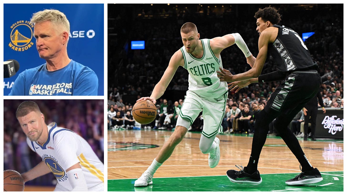 Back in present day, there will be a minutes restriction for Kristaps, though, as you’ll see in the next article when I post the transcripts from Wednesday’s practice. And my guess is that KP does not start, as hinted by Kerr in the Wednesday podium — but, like Al Horford in the first stages of his minutes restriction, coming off the bench might afford Porzingis the opportunity to close the game. We’ll see.