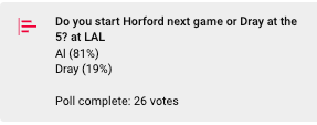 So, Kerr will go with the same Draymond-Green-alongside-Al-Horford lineup and that won by a landslide in our live poll ā which was basically the same sentiment for Opening Night (against the Lakers yet again):